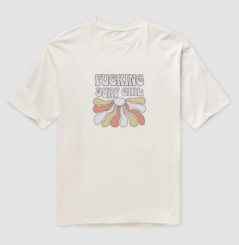 Camiseta oversized em algodão levinho e macio com estampa inspirada nas incríveis e brabas mulheres surfistas. A modelo veste camiseta oversized areia tamanho P e tem 1,58m de altura.